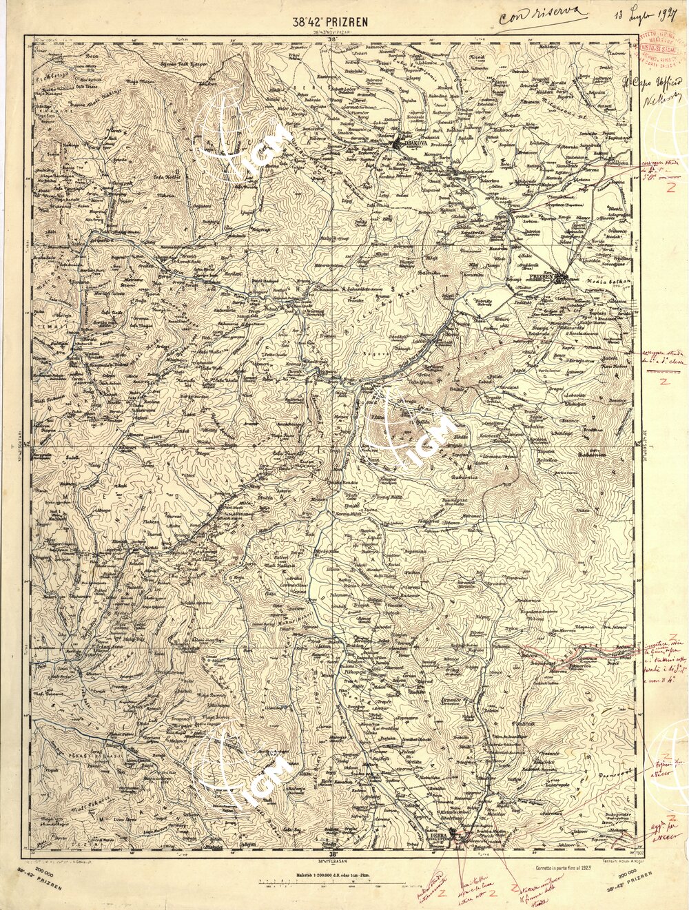 Carta austriaca, stampa I.G.M. 1927, rappresentazione orografica a sfumo, stampa 5 colori. Allegato inserto di lucidi con aggiornamenti in varie date: ( 1911;1918;1923 ) ed uno di Durazzo allestito nel 1940.