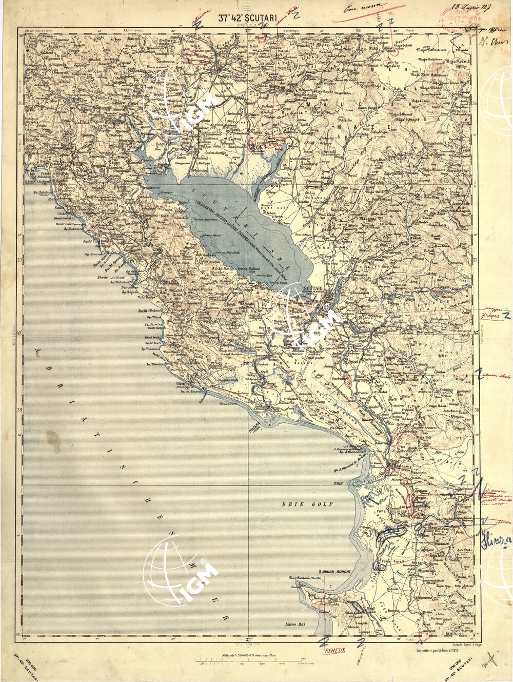 Carta austriaca, stampa I.G.M. 1927, rappresentazione orografica a sfumo, stampa 5 colori. Allegato inserto di lucidi con aggiornamenti in varie date: ( 1911;1918;1923 ) ed uno di Durazzo allestito nel 1940.