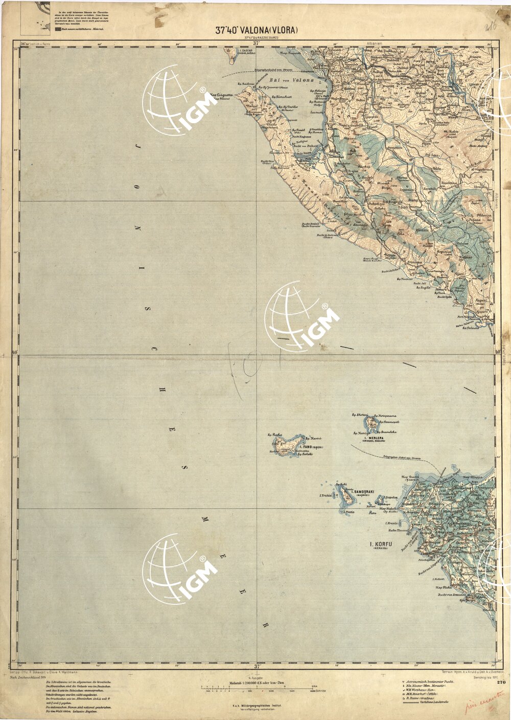 Carta austriaca, stampa I.G.M. 1927, rappresentazione orografica a sfumo, stampa 5 colori. Allegato inserto di lucidi con aggiornamenti in varie date: ( 1911;1918;1923 ) ed uno di Durazzo allestito nel 1940.
