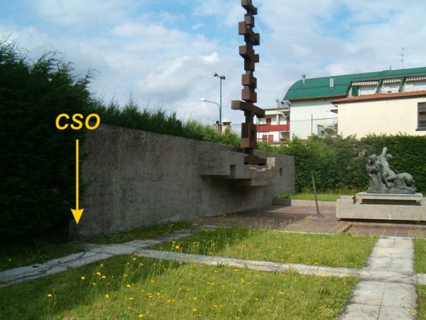 | Contrassegni | [{"simbolo_contrassegno":"B1","materializzazione":"(CSO) – Bullone infisso sul muro di sfondo del monumento i caduti, presso l'estremo sinistro."},{"simbolo_contrassegno":"V1","materializzazione":"(CSV) – Mensola sulla facciata, a sinistra della porta principale. (La mensola \u00e8 stata spostata pi\u00f9 in basso)"}] |