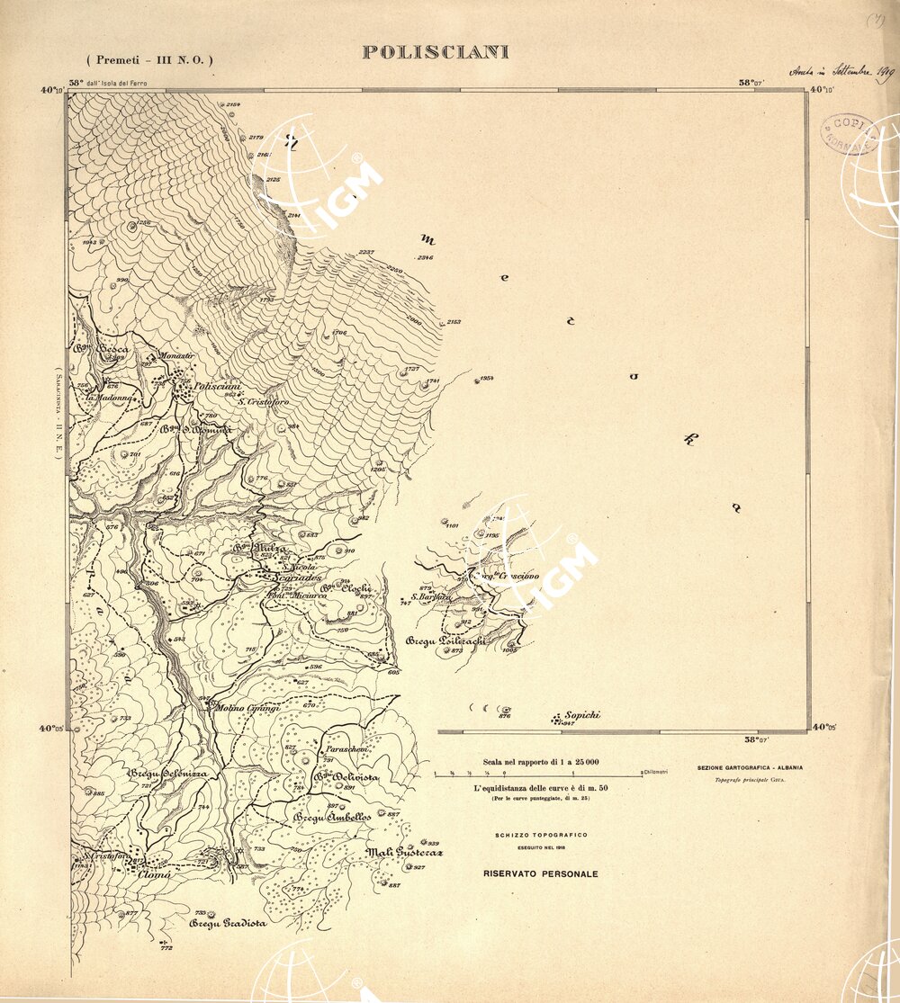 Carta ricavata mediante ingrandimento fotomeccanico dai rilievi alla scala di 1:50.000 dalla Sezione Cartografica del Comando XVI Corpo d’ Armata in Albania.