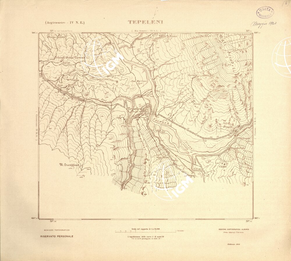 Carta ricavata mediante ingrandimento fotomeccanico dai rilievi alla scala di 1:50.000 dalla Sezione Cartografica del Comando XVI Corpo d’ Armata in Albania.