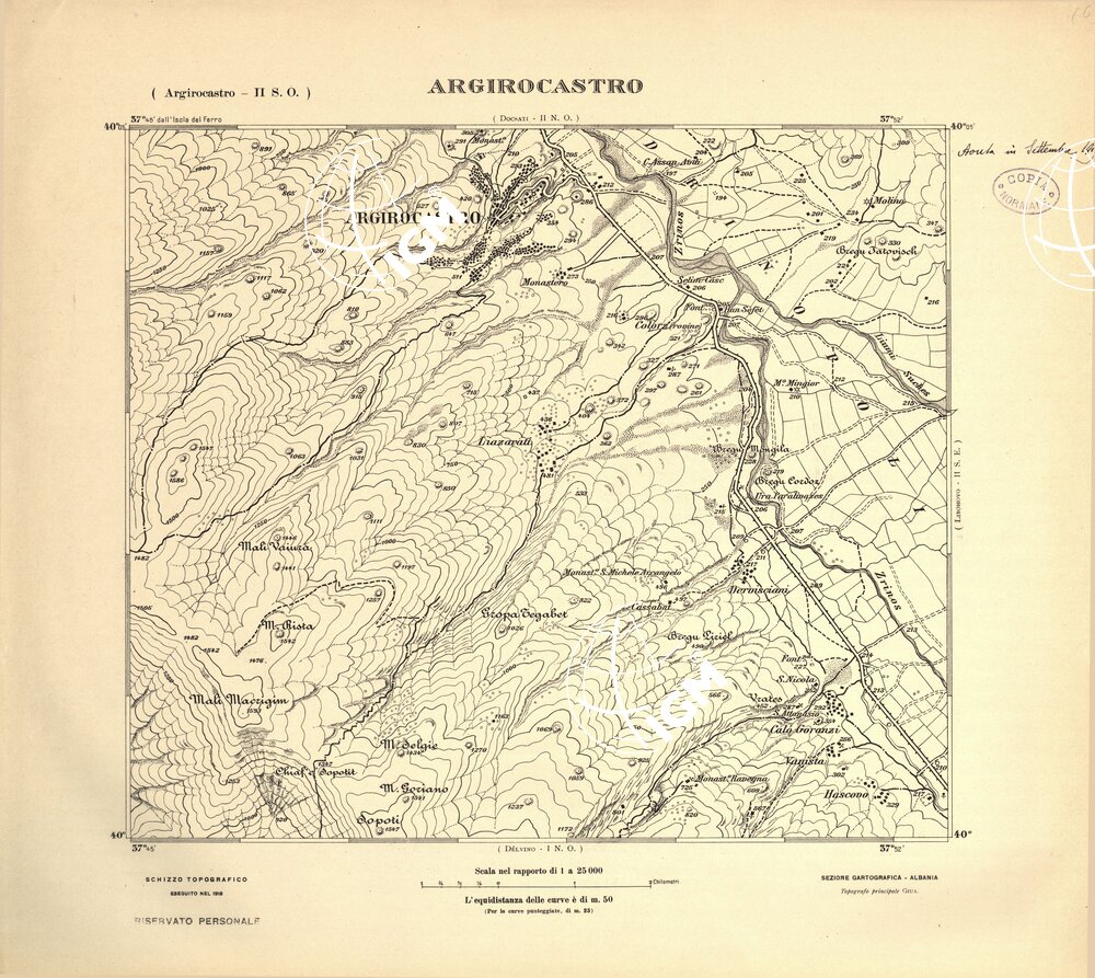 Carta ricavata mediante ingrandimento fotomeccanico dai rilievi alla scala di 1:50.000 dalla Sezione Cartografica del Comando XVI Corpo d’ Armata in Albania.