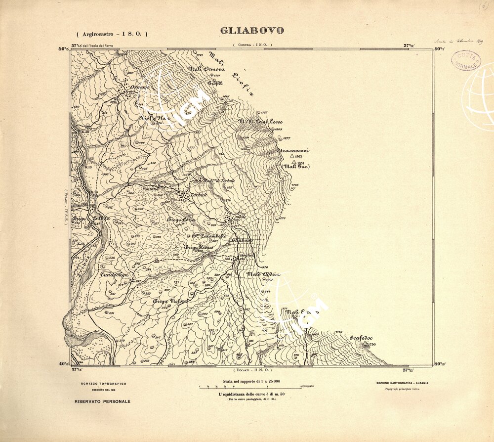 Carta ricavata mediante ingrandimento fotomeccanico dai rilievi alla scala di 1:50.000 dalla Sezione Cartografica del Comando XVI Corpo d’ Armata in Albania.