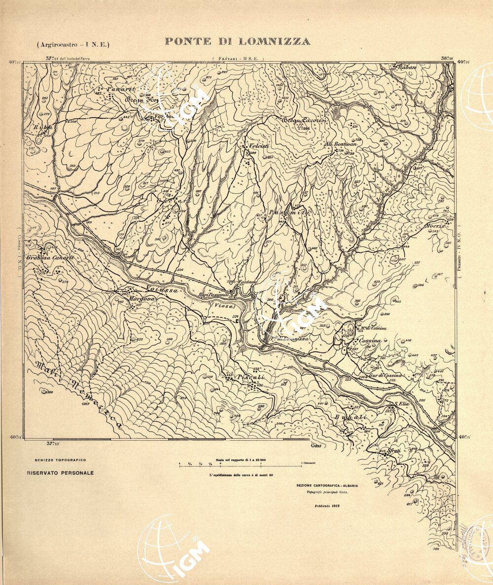 Carta ricavata mediante ingrandimento fotomeccanico dai rilievi alla scala di 1:50.000 dalla Sezione Cartografica del Comando XVI Corpo d’ Armata in Albania.