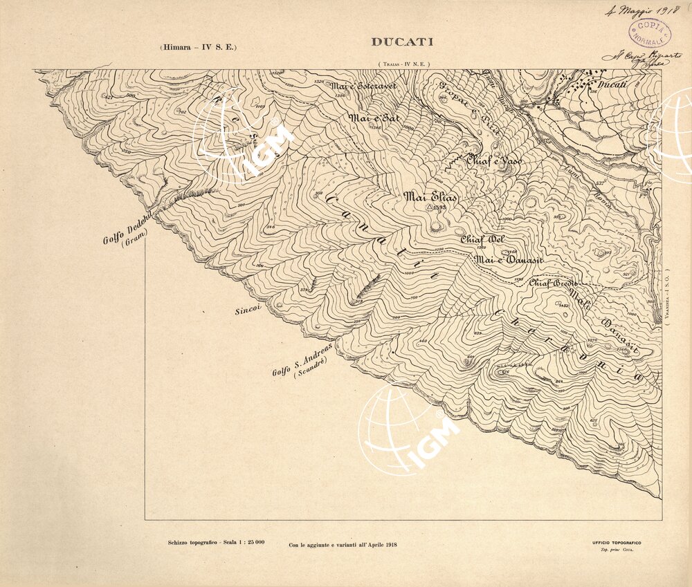 Carta ricavata mediante ingrandimento fotomeccanico dai rilievi alla scala di 1:50.000 dalla Sezione Cartografica del Comando XVI Corpo d’ Armata in Albania.