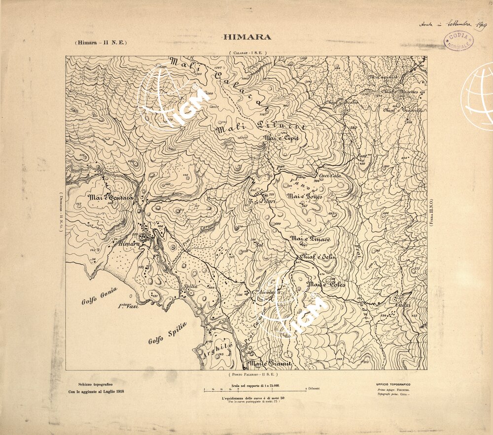Carta ricavata mediante ingrandimento fotomeccanico dai rilievi alla scala di 1:50.000 dalla Sezione Cartografica del Comando XVI Corpo d’ Armata in Albania.