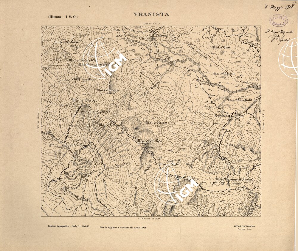 Carta ricavata mediante ingrandimento fotomeccanico dai rilievi alla scala di 1:50.000 dalla Sezione Cartografica del Comando XVI Corpo d’ Armata in Albania.
