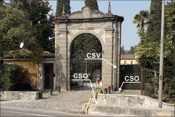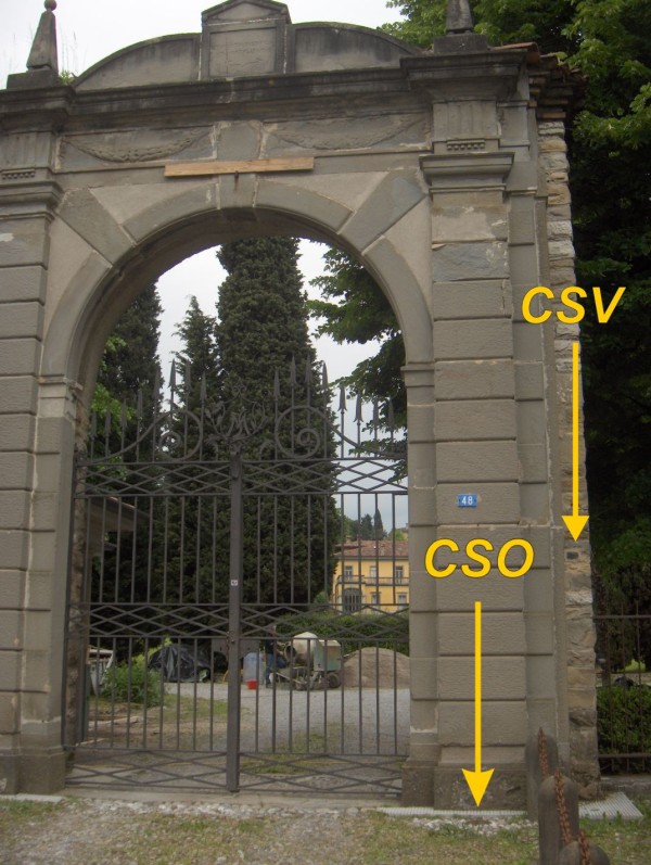 [{"simbolo_contrassegno":"P5","materializzazione":"(CSO) – Pozzetto protetto da tappo in ghisa a cm 40 dallo stipite sinistro della colonna di destra del cancello di accesso alla villla."},{"simbolo_contrassegno":"V4","materializzazione":"(CSV) – Piastrina L.P. 47, a destra del cso."},{"simbolo_contrassegno":"B4","materializzazione":"(CSO') – Centrino in acciaio inox del tipo universale infisso a sinistra del cancello e in corrispondenza del cordolo lato strada che delimita la ciclabile tombata"}]