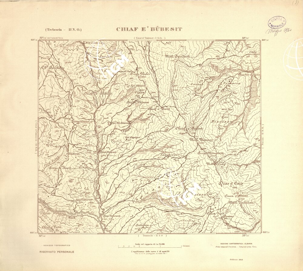 Carta ricavata mediante ingrandimento fotomeccanico dai rilievi alla scala di 1:50.000 dalla Sezione Cartografica del Comando XVI Corpo d’ Armata in Albania.
