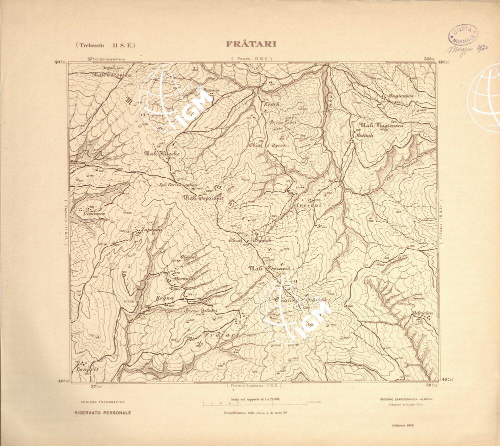 Carta ricavata mediante ingrandimento fotomeccanico dai rilievi alla scala di 1:50.000 dalla Sezione Cartografica del Comando XVI Corpo d’ Armata in Albania.