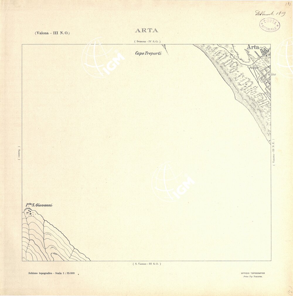 Carta ricavata mediante ingrandimento fotomeccanico dai rilievi alla scala di 1:50.000 dalla Sezione Cartografica del Comando XVI Corpo d’ Armata in Albania.