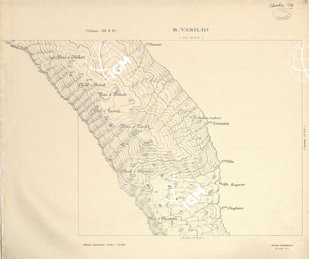 Carta ricavata mediante ingrandimento fotomeccanico dai rilievi alla scala di 1:50.000 dalla Sezione Cartografica del Comando XVI Corpo d’ Armata in Albania.