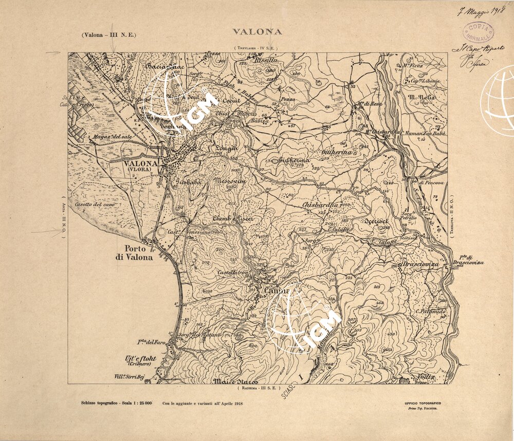 Carta ricavata mediante ingrandimento fotomeccanico dai rilievi alla scala di 1:50.000 dalla Sezione Cartografica del Comando XVI Corpo d’ Armata in Albania.