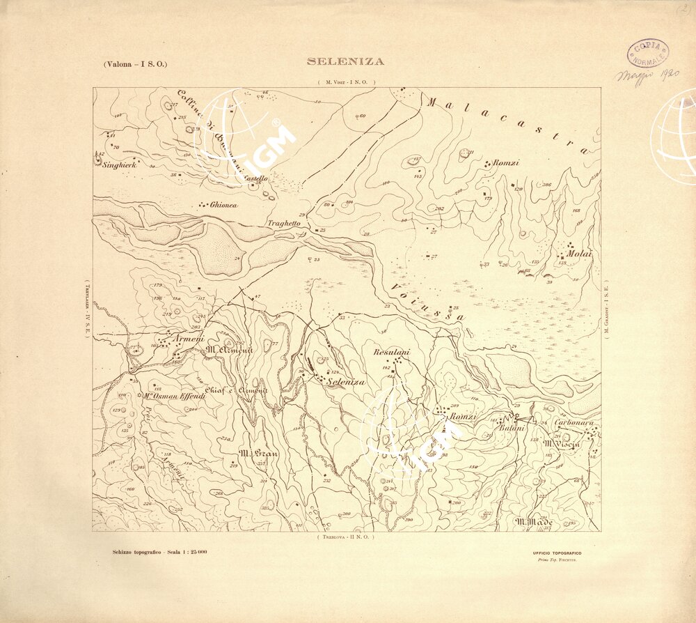 Carta ricavata mediante ingrandimento fotomeccanico dai rilievi alla scala di 1:50.000 dalla Sezione Cartografica del Comando XVI Corpo d’ Armata in Albania.
