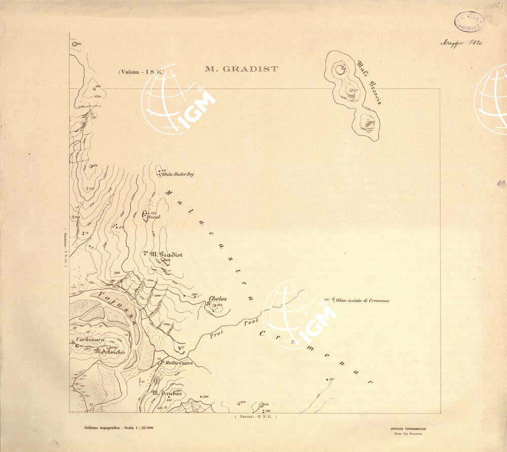 Carta ricavata mediante ingrandimento fotomeccanico dai rilievi alla scala di 1:50.000 dalla Sezione Cartografica del Comando XVI Corpo d’ Armata in Albania.