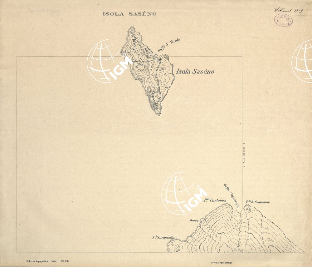 Carta ricavata mediante ingrandimento fotomeccanico dai rilievi alla scala di 1:50.000 dalla Sezione Cartografica del Comando XVI Corpo d’ Armata in Albania.