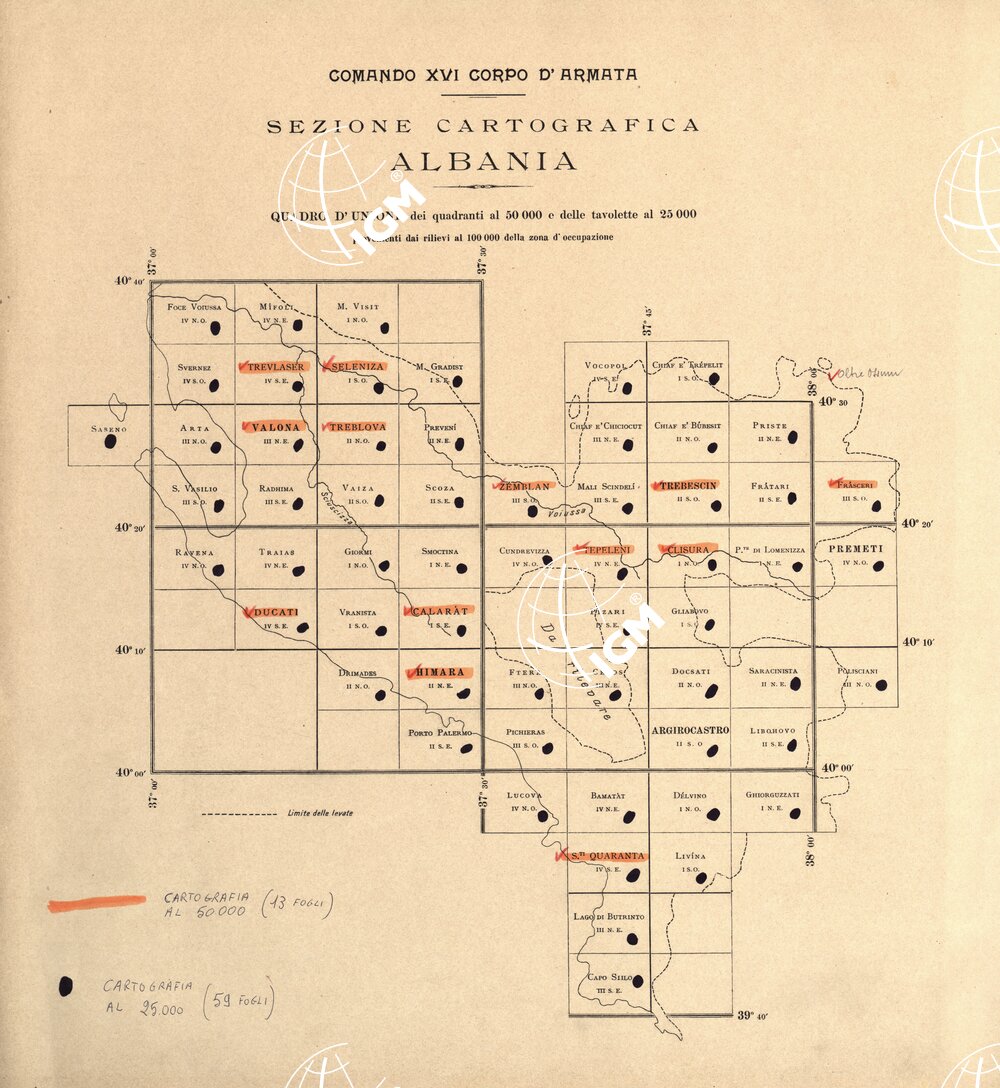 Carta ricavata mediante ingrandimento fotomeccanico dai rilievi alla scala di 1:50.000 dalla Sezione Cartografica del Comando XVI Corpo d’ Armata in Albania.
