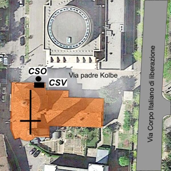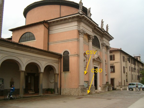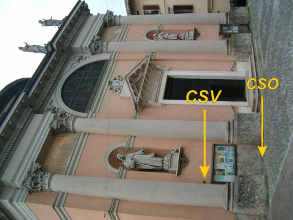 [{"simbolo_contrassegno":"P3","materializzazione":"(CSO) – Chiusino in ghisa alla base della facciata, a sinistra della porta tra le due colonne. Alto non misurabile."},{"simbolo_contrassegno":"V1","materializzazione":"(CSV) – Mensola sulla facciata, in corrispondenza del cso."}]
