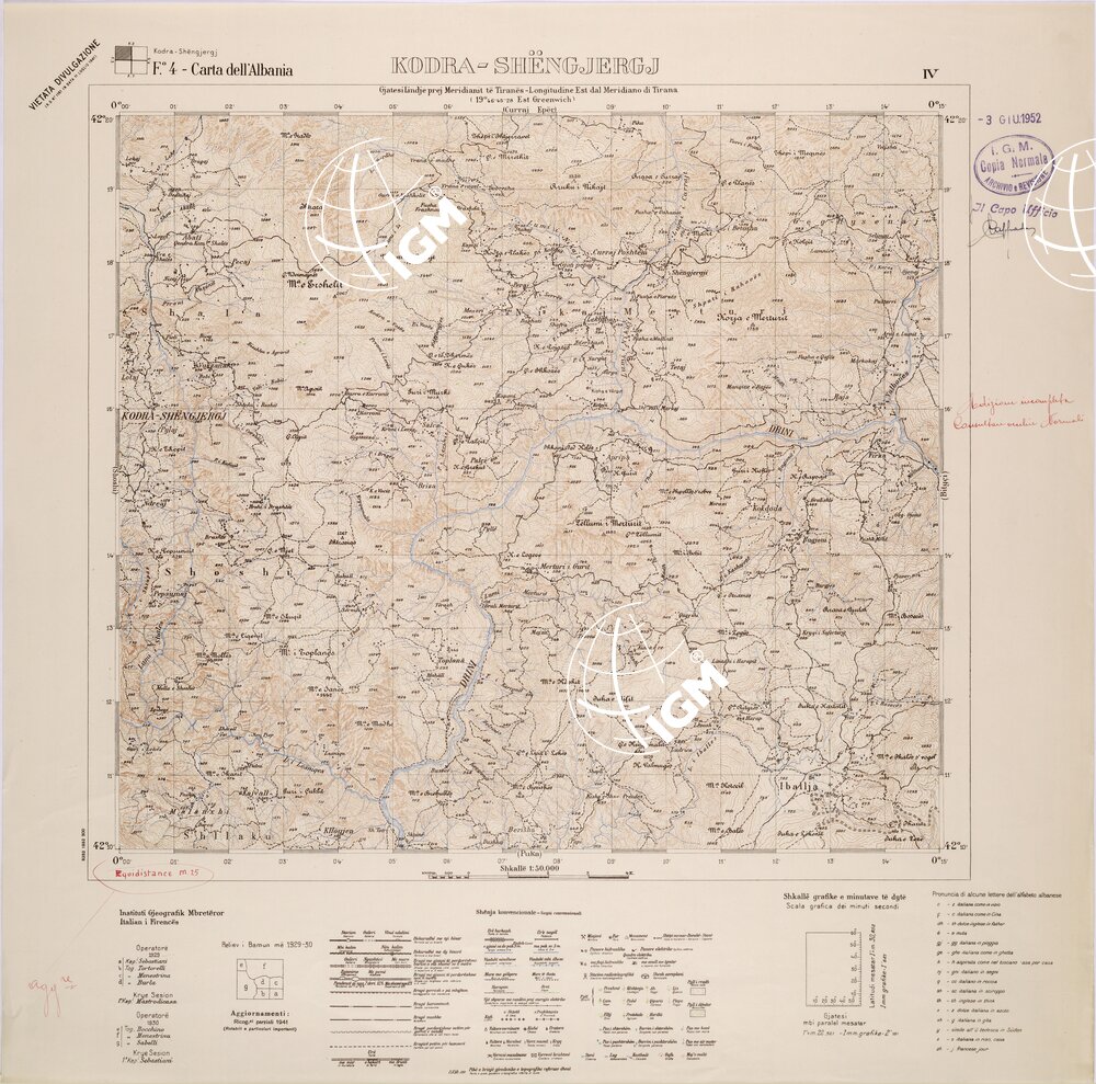 Rilievo diretto e aerofotogrammetrico. Proiezione Autalica (Conica Sinusoidale) detta di Bonne, elementi dell'ellissoide di Bessel. Stampa in nero per i primi rilievi e per l'edizione provvisoria,per i piu' recenti stampa a colori. Equidistanza delle curve m.25.