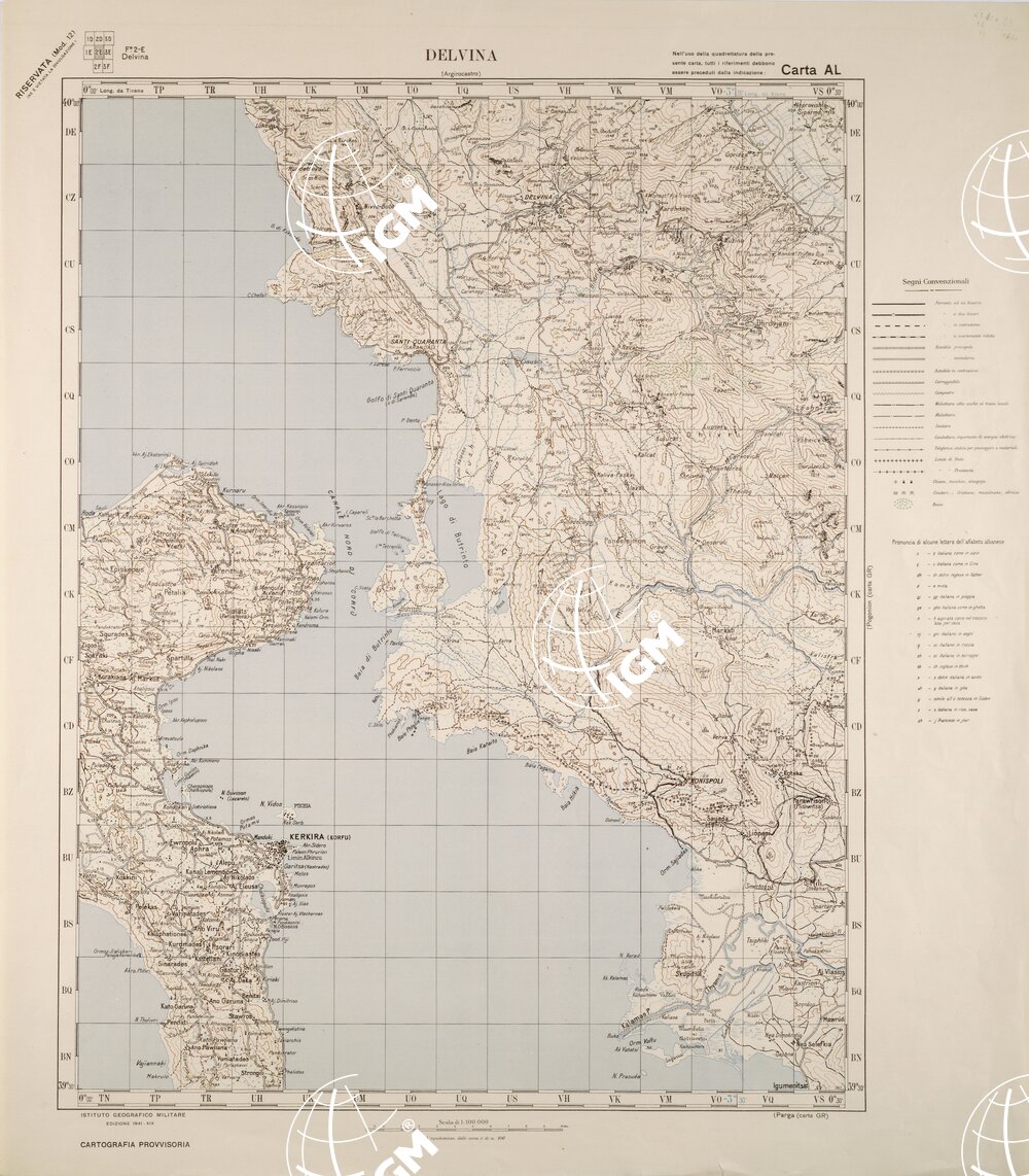 Disegni originali a penna su carta lucida montata su cartoncino americano, a colori separati: nero,blu,bistro,verde. Gli originali si trovano insieme a quelli della carta”J”, armadio 77 sup. Equidistanza tra le curve di m.100