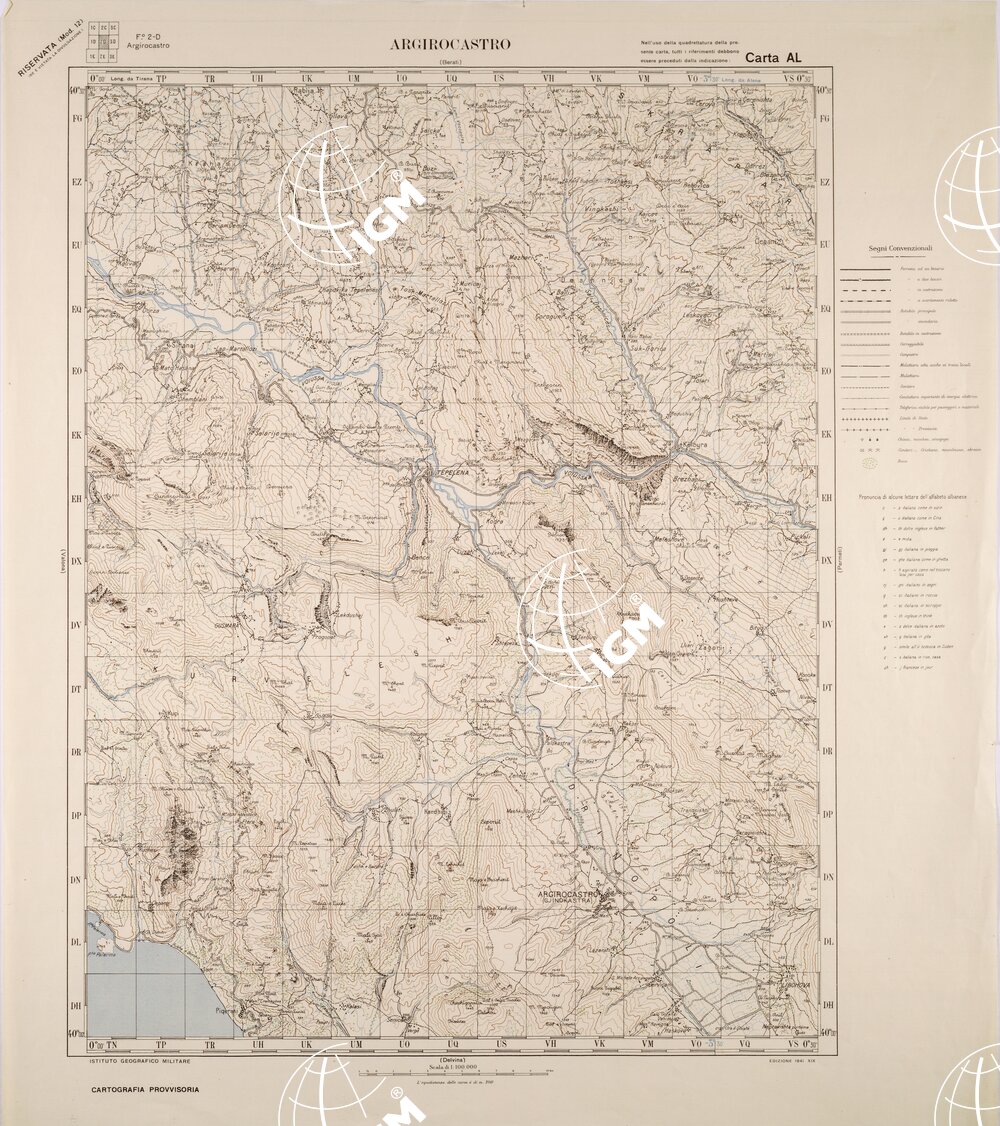 Disegni originali a penna su carta lucida montata su cartoncino americano, a colori separati: nero,blu,bistro,verde. Gli originali si trovano insieme a quelli della carta”J”, armadio 77 sup. Equidistanza tra le curve di m.100