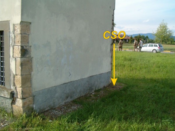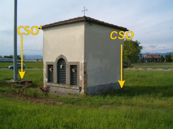 [{"simbolo_contrassegno":"P3","materializzazione":"(CSO) – Chiusino in ghisa a 40 cm dallo spigolo destro del fianco destro della cappella della Madonna di Loreto, al centro della rotatoria. CSO Alto non misurabile."},{"simbolo_contrassegno":"B4","materializzazione":"(CSO') – Centrino in acciaio inox di tipo universale IGM infisso presso lo spigolo ovest del basamento dell'illuminazione pubblica"}]