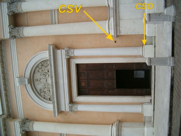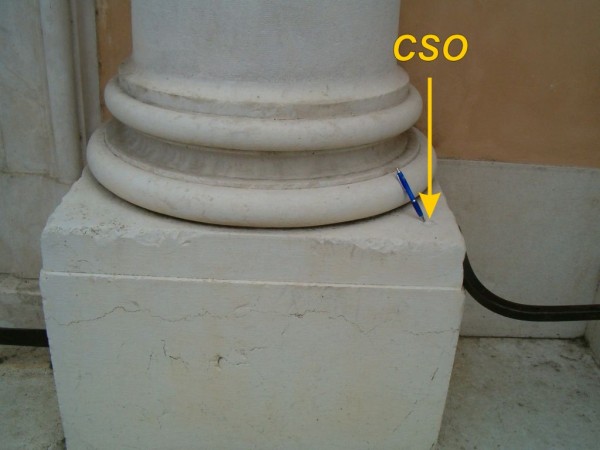 [{"simbolo_contrassegno":"B3","materializzazione":"(CSO) – Cerchio inciso sul basamento della colonna destra della porta principale."},{"simbolo_contrassegno":"V3","materializzazione":"(CSV) – Piastrina antica infissa sulla facciata a destra della porta."}]