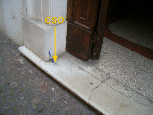 | Contrassegni | [{"simbolo_contrassegno":"P2","materializzazione":"(CSO) – Chiusino in ghisa alla base del fianco sinistro, a m 4,30 dall'ultima porta."},{"simbolo_contrassegno":"B3","materializzazione":"(CSO') – Cerchio inciso sulla sinistra del gradino di accesso della porta secondaria, a m 13,90 dal CSO."}] |