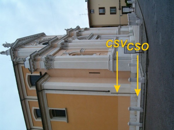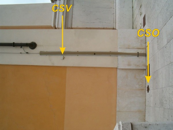 [{"simbolo_contrassegno":"P2","materializzazione":"(CSO) – Chiusino alla base del fianco sinistro, a m 1,55 dallo spigolo destro."},{"simbolo_contrassegno":"V1","materializzazione":"(CSV) – Mensola infissa sulla lesena, in corrispondenza del CSO."}]