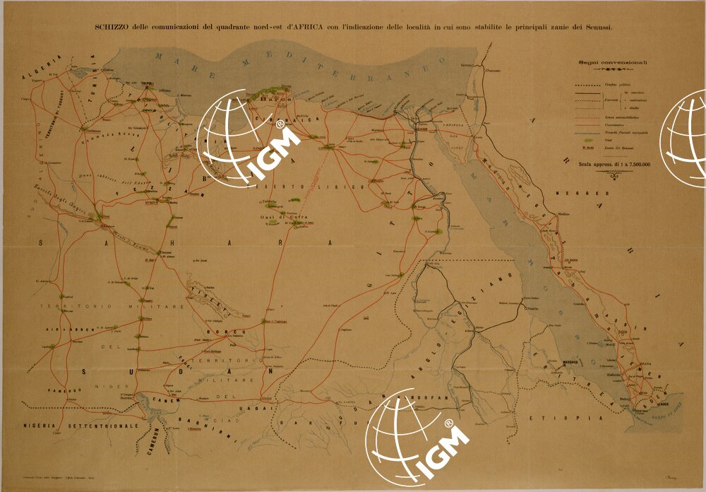 SCHIZZO DELLE COMUNICAZIONI DEL QUADRANTE NORD – EST D’ AFRICA CON L’ INDICAZIONE DELLE LOCALITA’ IN CUI SONO STABILITE LE PRINCIPALI ZAUIE DEI SENUSSI