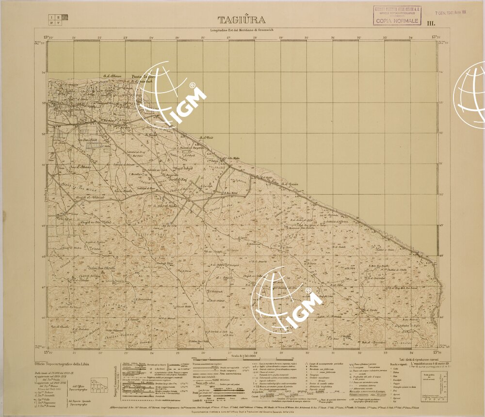 Carta realizzata dall’ Ufficio Topocartografico della Libia dai rilievi alla scala di 1:25.000 del 1931 aggiornati nel 1939 – 1940 Toponomastica riveduta a cura dell’ Ufficio Studi e Traduzioni del Governo della Libia.