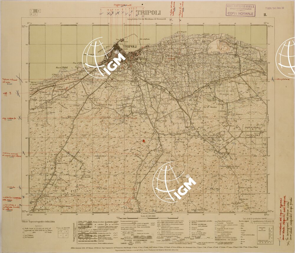Carta realizzata dall’ Ufficio Topocartografico della Libia dai rilievi alla scala di 1:25.000 del 1931 aggiornati nel 1939 – 1940 Toponomastica riveduta a cura dell’ Ufficio Studi e Traduzioni del Governo della Libia.