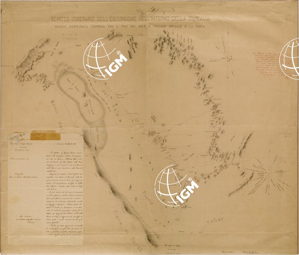 Schizzo dell’ itinerario compiuto dalla Compagnia Costiera incaricata dal Governo della Colonia nella regione allora inesplorata compresa fra il Pian del Sale il Vulcano Erta Ale e la costa