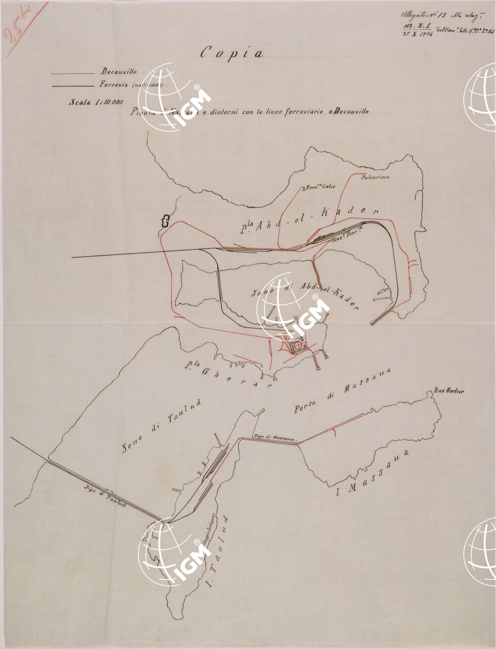 PIANTA DI MASSAUA E DINTORNI CON LE LINEE FERROVIARIE E DECAUVILLE