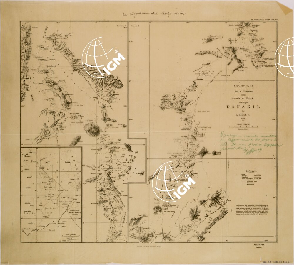 Originale su carta lucida della carta pubblicata dalla Royal Geographical Society, realizzata durante l’ esplorazione dell’ Ingegnere Lodovico Nesbitt e degli Italiani Tullio Pastore e G. Rosina con lo scopo, oltre al contributo alle conoscenze geografiche, di ritrovare il luogo dove Gustavo Bianchi fu ucciso ed erigervi una tomba ed un monumento in ricordo del sacrificio, opera che la spedizione fu costretta ad interrompere per sottrarsi ad un ulteriore eccidio.