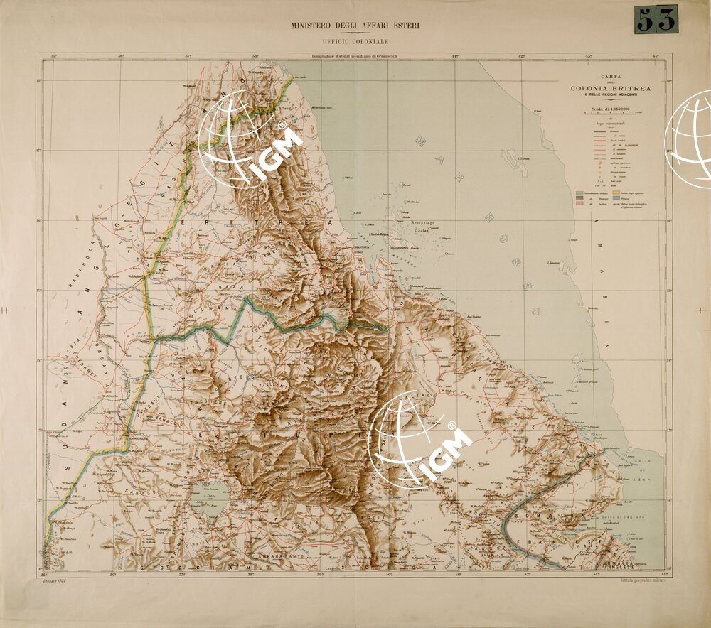 Carta compilata dall’ IGM per conto dell’ Ufficio Coloniale del Ministero degli Esteri usando come fonti di compilazione la carta alla scala di 1:500.000 del Capitano Miani per il territorio della Colonia e cartografia IGM alla scala di 1:400.000 per i territori circostanti.