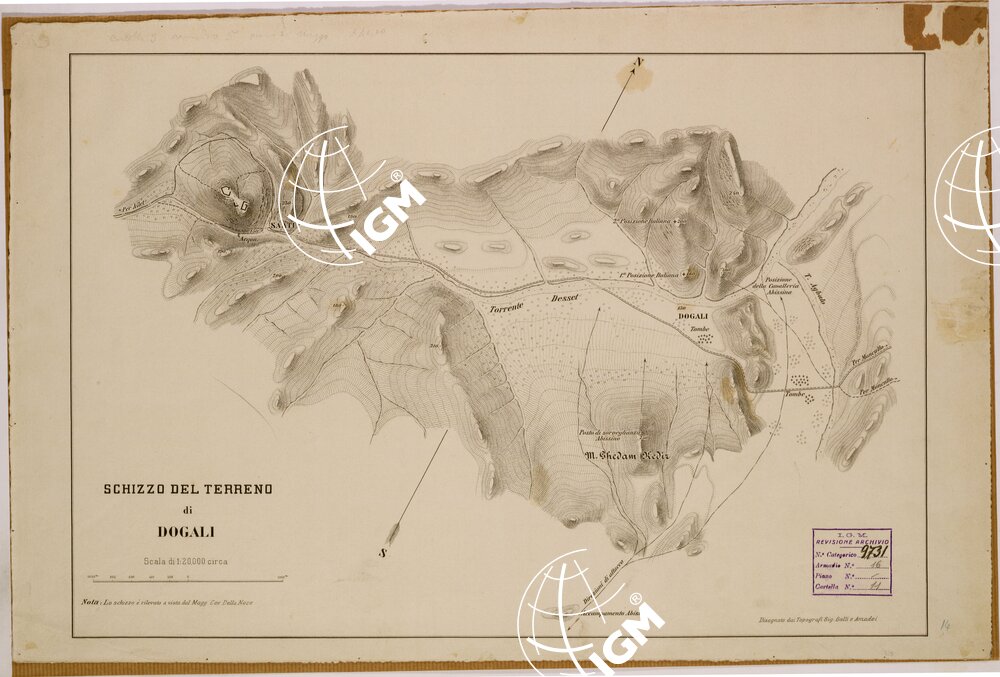 Schizzo originale disegnato a vista, sono indicate le posizioni militari del combattimento di Dogali.