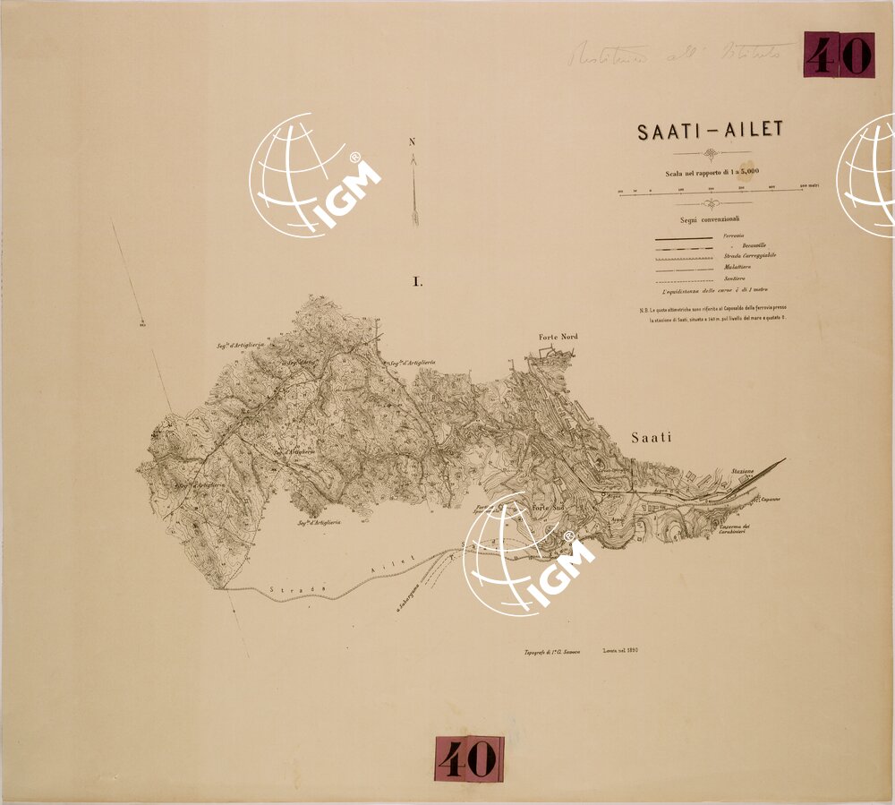 Cinque carte rilevate nel 1890 e 1891 che servirono ad un ingrandimento alla scala di 1:2.500 richiesto dal Comandante della Colonia Eritrea per lo studio della continuazione della ferrovia fino ad Ailet. Il foglio III contiene un quadro d’ unione alla scala di 1:50.000