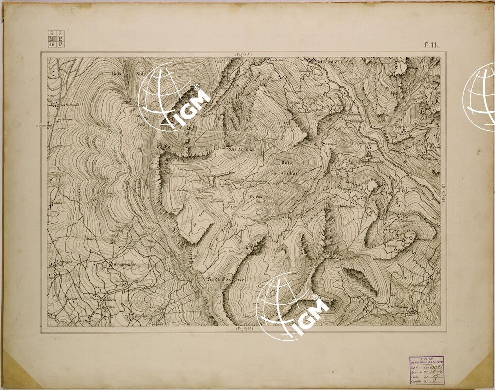 disegnata a penna su cartone la carta è stata compilata mediante ingrandimento dei rilievi al 50.000 per la parte Italiana e della ” carte de la frontiere des alpes ” alla scala di 80.000 per il territorio Francese.