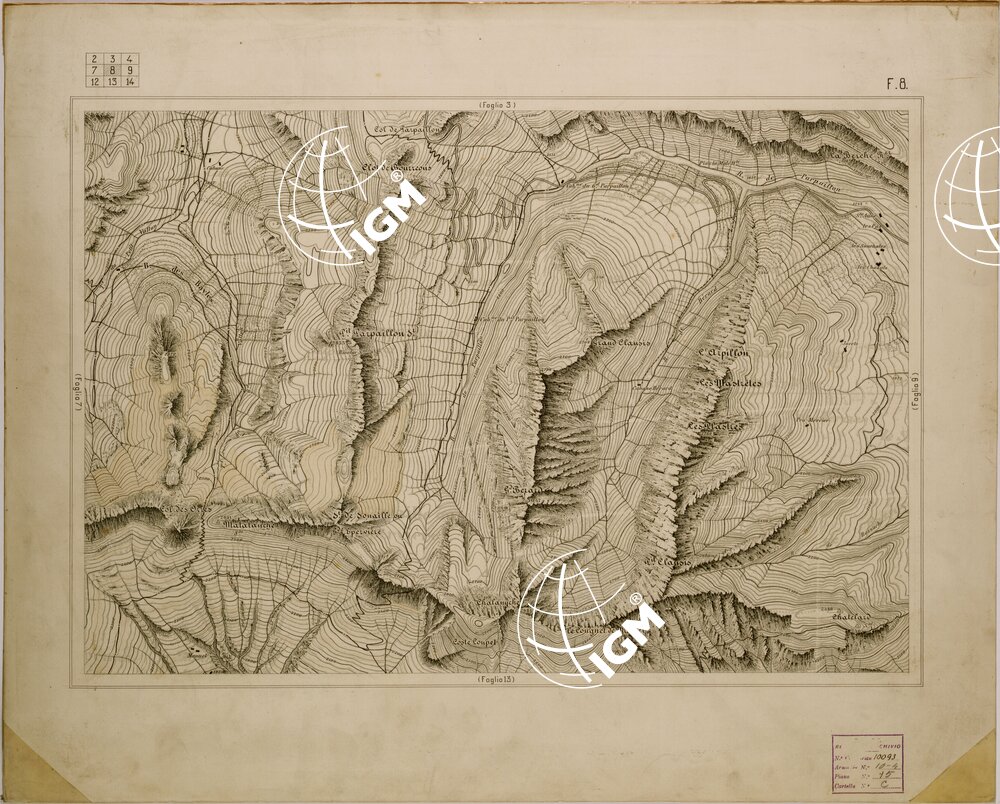 disegnata a penna su cartone la carta è stata compilata mediante ingrandimento dei rilievi al 50.000 per la parte Italiana e della ” carte de la frontiere des alpes ” alla scala di 80.000 per il territorio Francese.