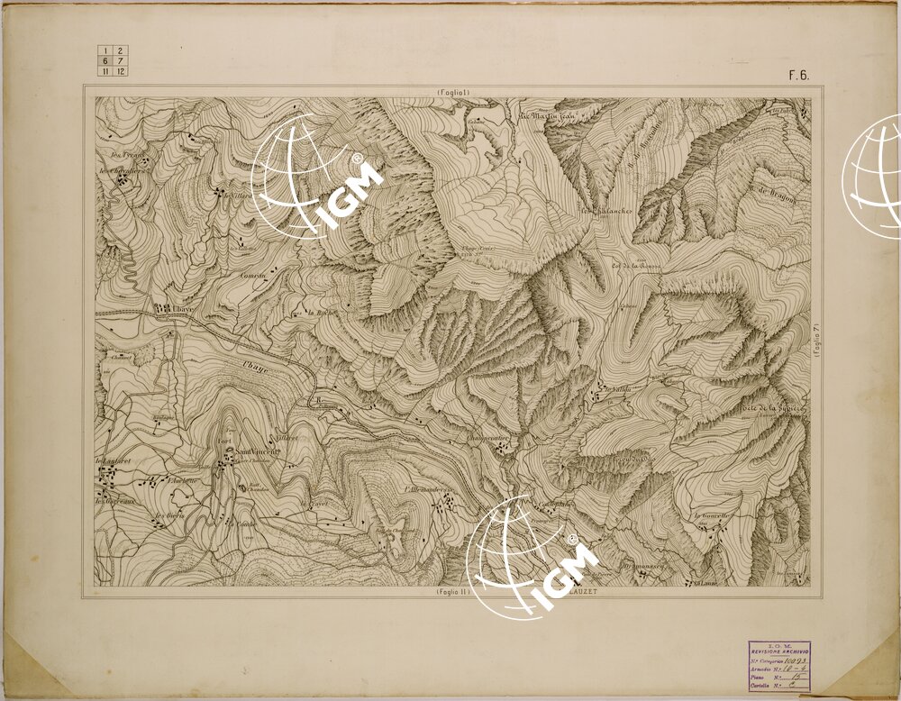 disegnata a penna su cartone la carta è stata compilata mediante ingrandimento dei rilievi al 50.000 per la parte Italiana e della ” carte de la frontiere des alpes ” alla scala di 80.000 per il territorio Francese.