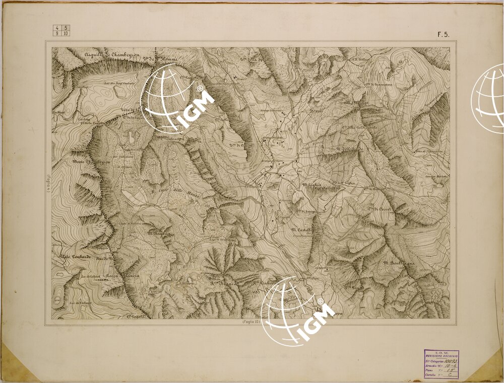 disegnata a penna su cartone la carta è stata compilata mediante ingrandimento dei rilievi al 50.000 per la parte Italiana e della ” carte de la frontiere des alpes ” alla scala di 80.000 per il territorio Francese.