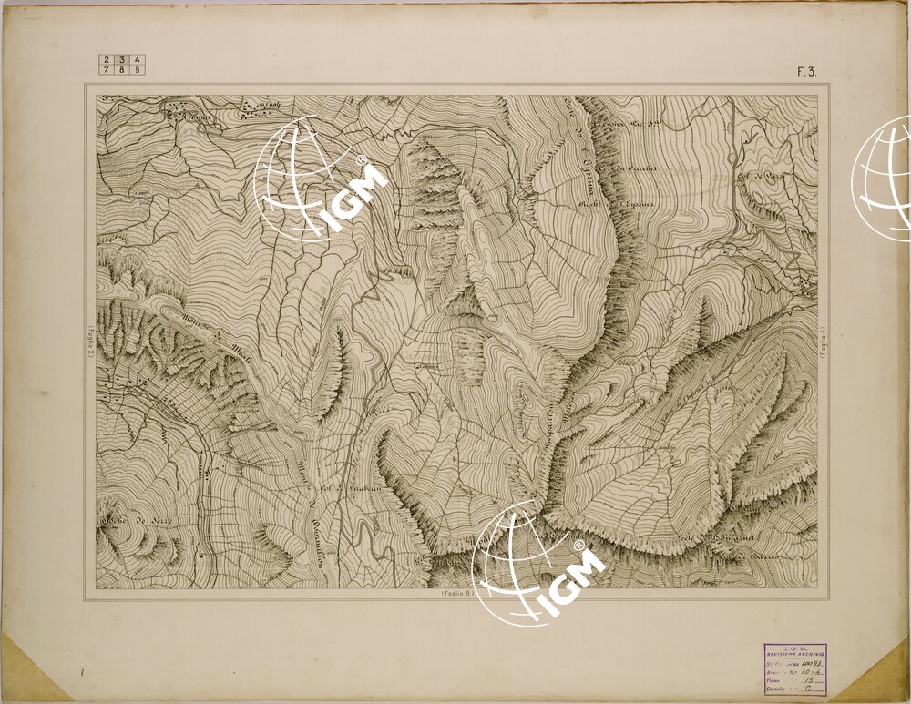 disegnata a penna su cartone la carta è stata compilata mediante ingrandimento dei rilievi al 50.000 per la parte Italiana e della ” carte de la frontiere des alpes ” alla scala di 80.000 per il territorio Francese.
