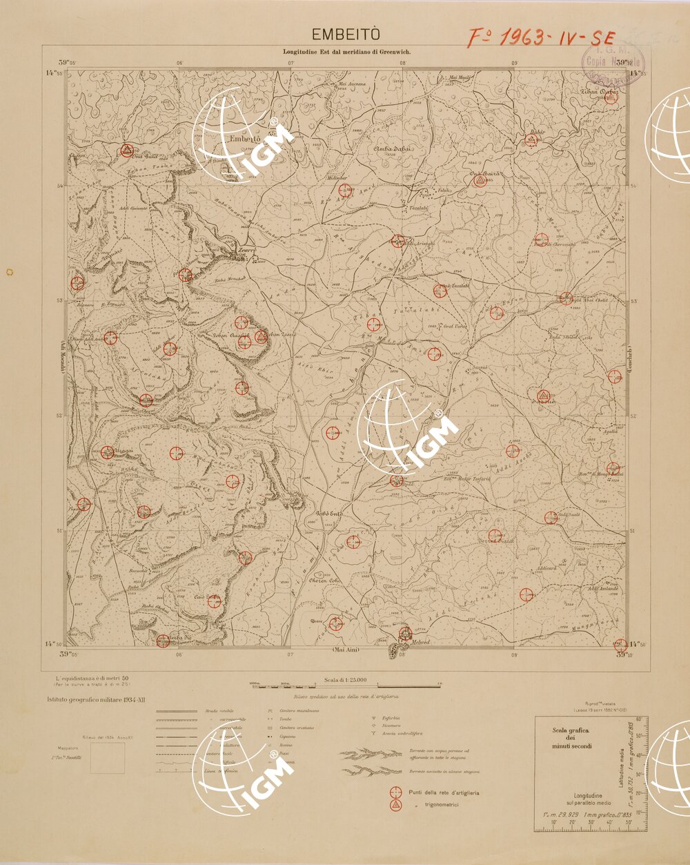 Carta realizzata dall’ IGM da rilievi eseguiti dall’ Ufficio Topocartografico dell’ Eritrea allo scopo di raffittire la rete geodetica e mettere in evidenza i punti della rete di artiglieria.