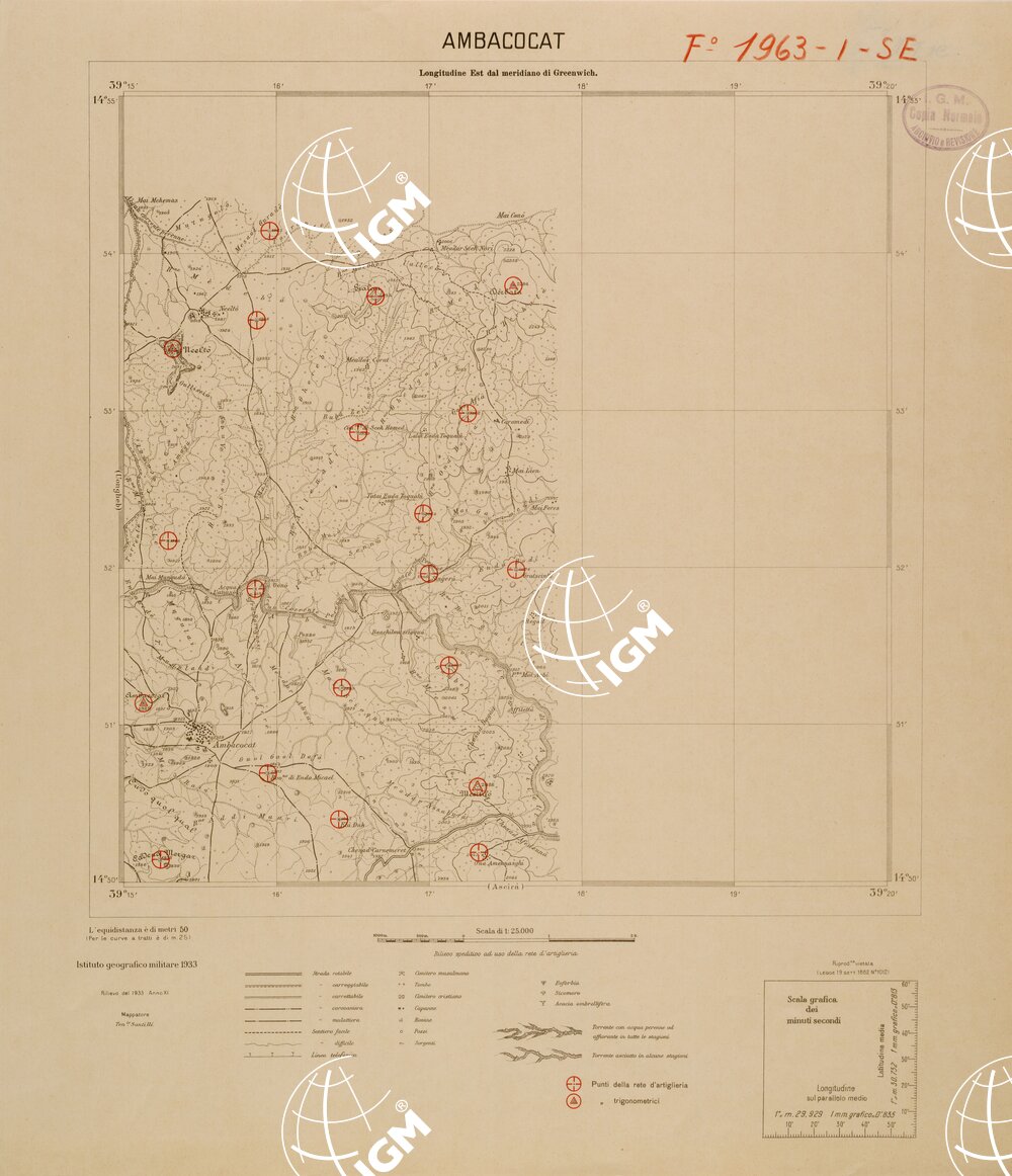 | Titolo proprio | CARTA DELL'ERITREA – FOGLIO 1963 I SE – AMBACOCAT – COPIA CON I PUNTI D'ARTIGLIERIA IN ROSSO |