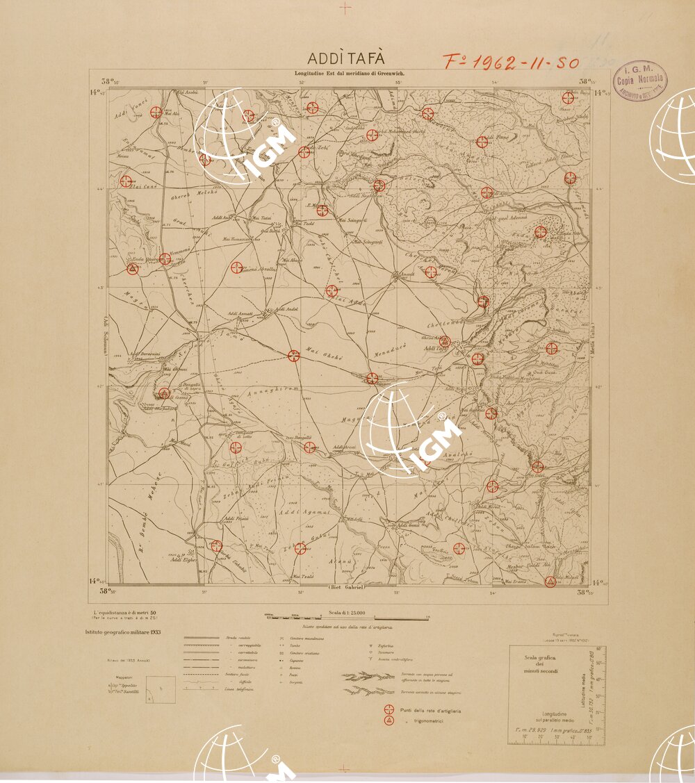 | Titolo proprio | CARTA DELL'ERITREA – FOGLIO 1962 II SO – ADDI TAFA – COPIA CON I PUNTI D'ARTIGLIERIA IN ROSSO |