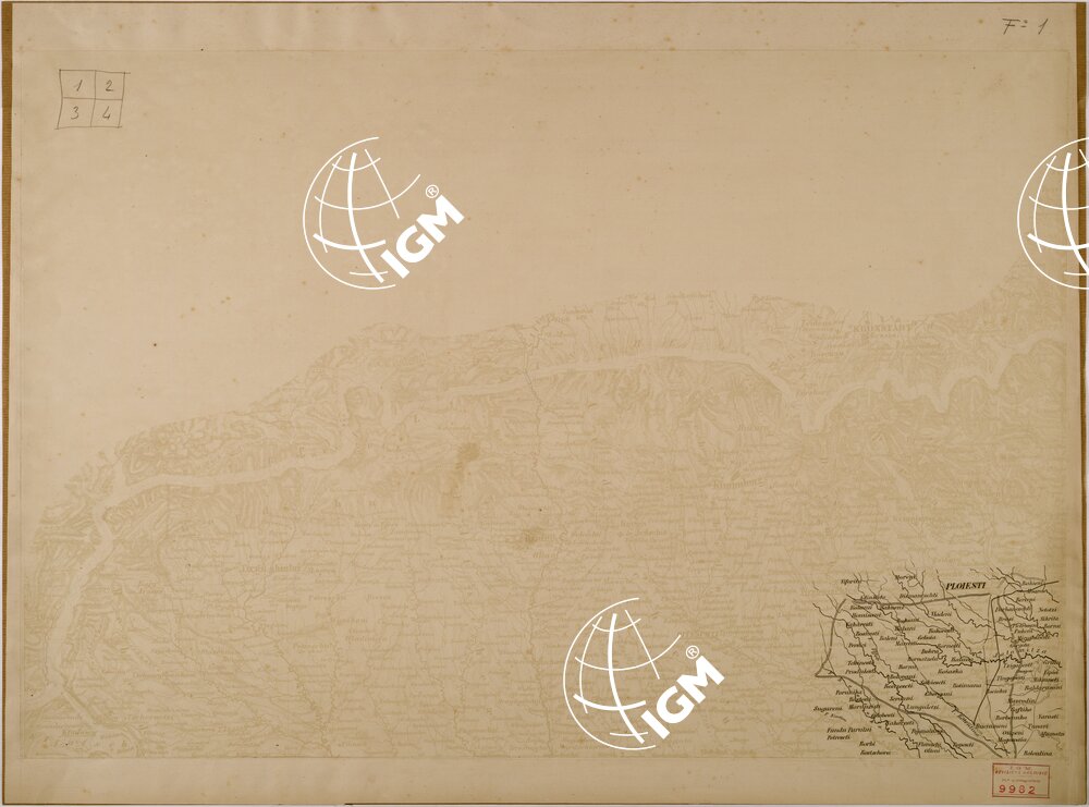 Originali compilati presumibilmente nel 1888 ma non completati, in particolare, del foglio 1 ( Ploiesti ) sono disegnate la planimetria e le acque solo nell’ angolo sud – est, del foglio 2 ( Bocche del Danubio ) è disegnata la toponomastica e parte della planimetria e delle acque, del foglio 3 ( Bucarest ) sono disegnate quasi completamente la toponomastica la planimetria e le acque mentre il tratteggio è solo iniziatio, il foglio 4 ( Varna ) è disegnato completamente. Dovevano servire per l’ allestimento di una carta illustrativa della zona di guerra Russo Turca del 1877 – 1878 mai realizzata.