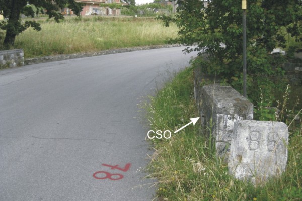 | Contrassegni | [{"simbolo_contrassegno":"B1","materializzazione":"(CSO) – Bullone infisso nel parapetto del ponticello, lato strada, a monte"}] |