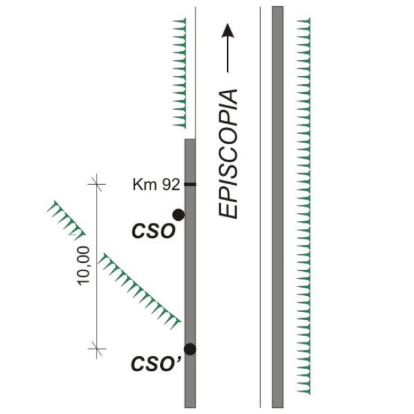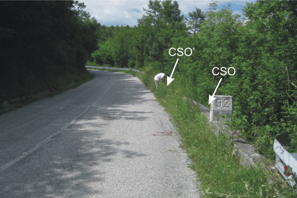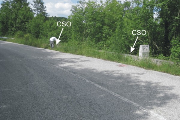 | Contrassegni | [{"simbolo_contrassegno":"B1","materializzazione":"(CSO) – Bullone infisso tra i conci del muro di scarpa in corrispondenza del Km 92+000, lato valle"},{"simbolo_contrassegno":"B4","materializzazione":"(CSO') – Centrino universale infisso sulla sommit\u00e0 di un elementro tronco in pietra a 10 metri dalla pietra chilometrica"}] |